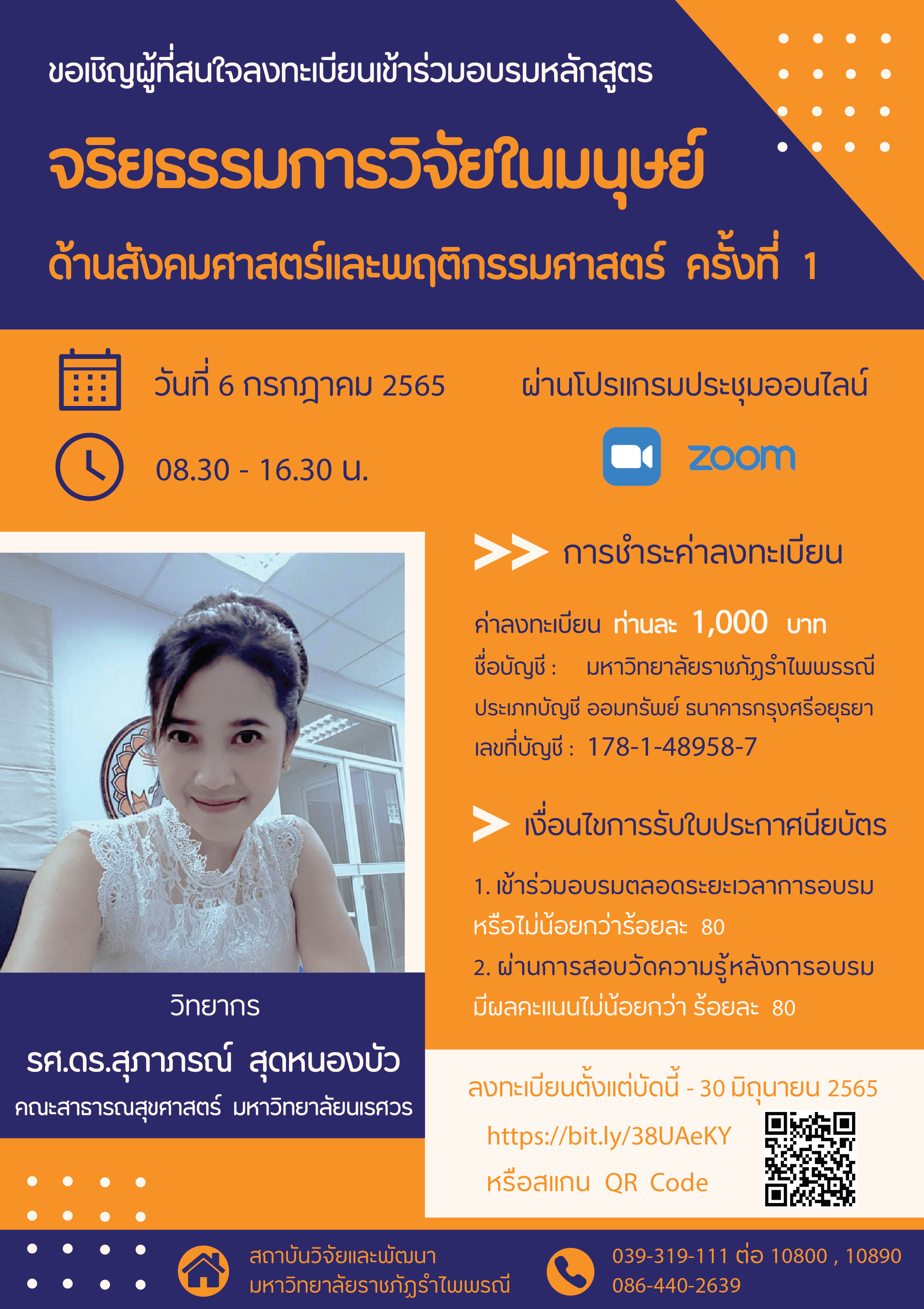 สถาบันวิจัยและพัฒนา มหาวิทยาลัยราชภัฏรำไพพรรณี ขอเชิญผู้ที่สนใจลงทะเบียนเข้าร่วมอบรมหลักสูตร