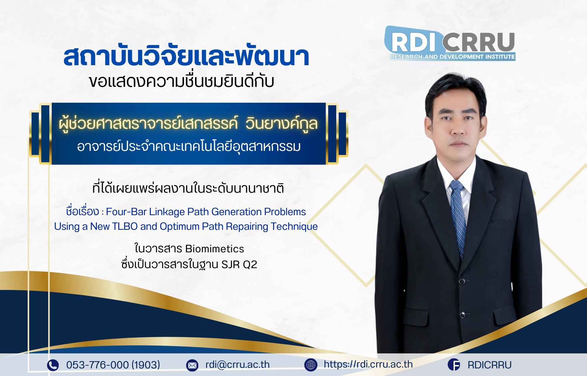 สถาบันวิจัยและพัฒนา ขอแสดงความชื่นชมและยินดีกับ ผู้ช่วยศาสตราจารย์เสกสรรค์ วินยางค์กูล อาจารย์ประจำคณะเทคโนโลยีอุตสาหกรรม ที่ได้เผยแพร่ผลงานวิชาการในระดับนานาชาติ เรื่อง : Four-Bar [...]