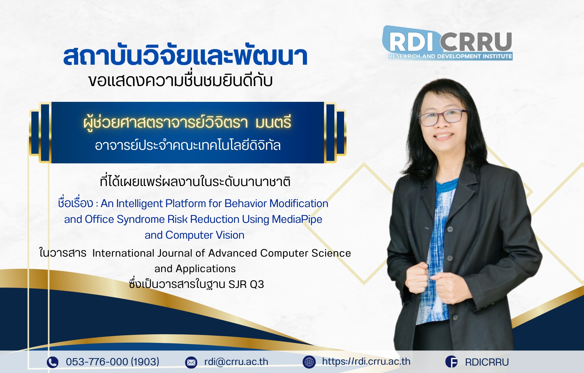สถาบันวิจัยและพัฒนา ขอแสดงความชื่นชมและยินดีกับ ผู้ช่วยศาสตราจารย์วิจิตรา มนตรี อาจารย์ประจำคณะเทคโนโลยีดิจิทัล ที่ได้เผยแพร่ผลงานวิชาการในระดับนานาชาติ เรื่อง : An [...]