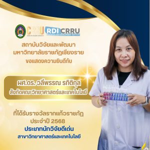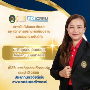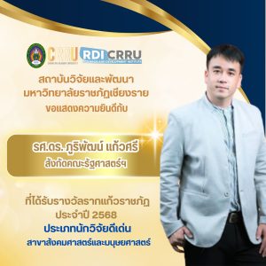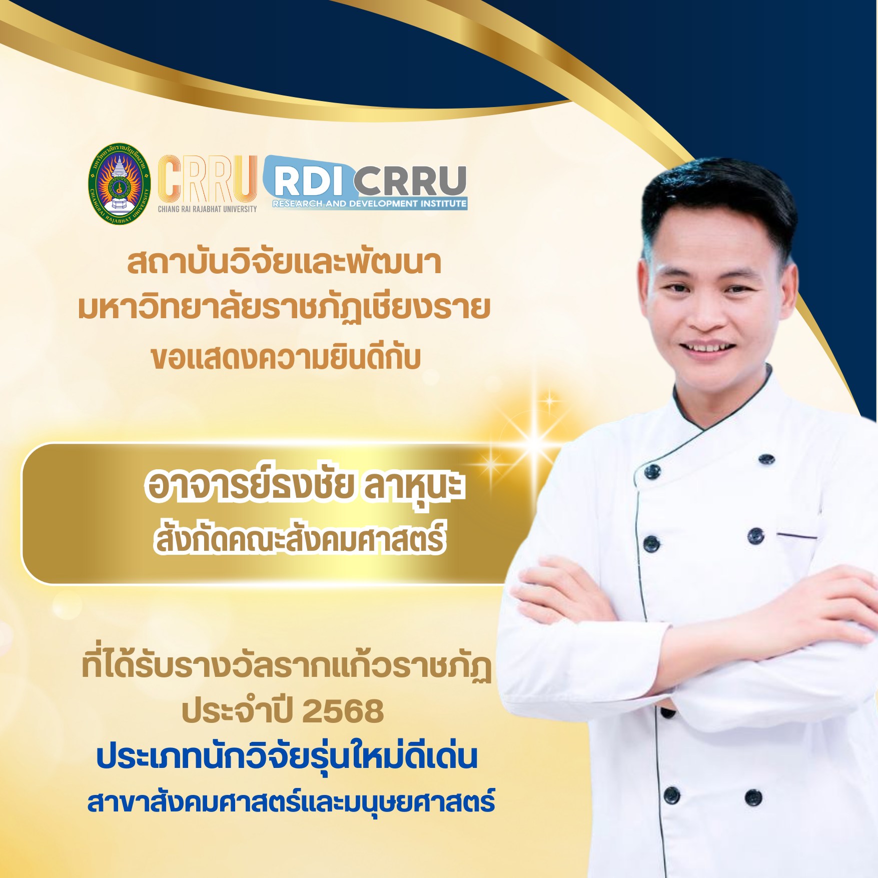 สถาบันวิจัยและพัฒนา มหาวิทยาลัยราชภัฏเชียงราย ขอแสดงความยินดีอย่างยิ่งกับนักวิจัยที่ได้รับรางวัลรากแก้วราชภัฏประจำปี พ.ศ.2568